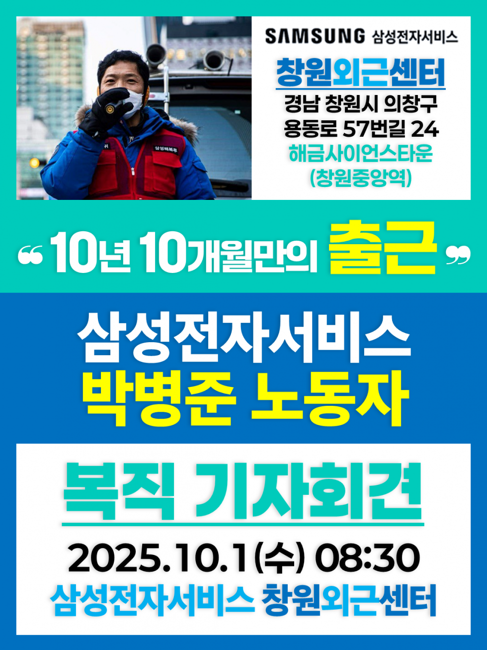 0. 오는 10월 1일, 삼성과의 근로자지위확인소송에서 승소한 박병준 노동자가 삼성전자서비스 창원센터에서 근무를 시작합니다. 법률 소송을 시작한 지 12년, 해고노동자가 된 지 10년 10개월만에 출근합니다. 폐업된 협력업체의 해고자가 아니라 삼성전자서비스 정규직이 되어 당당하게 복직 기자회견을 개최합니다.