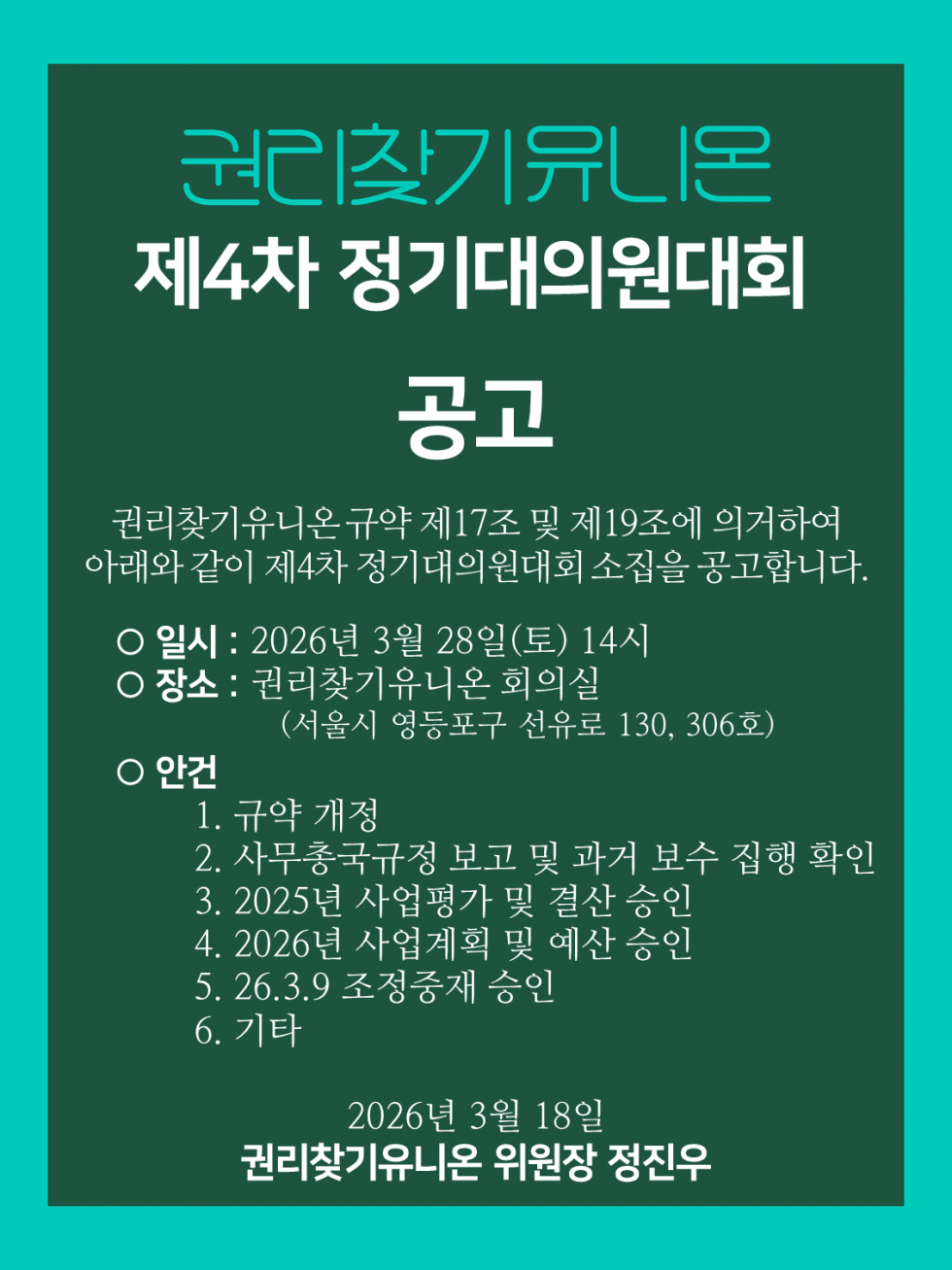 <권리찾기유니온 제4차 정기대의원대회 소집 공고문>