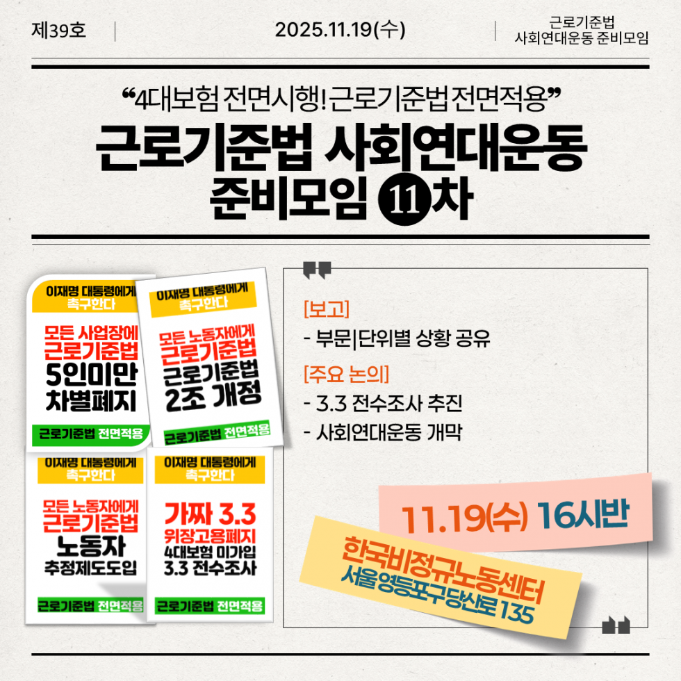 - 사회연대운동 준비모임 12차 : 26.1.8(목) 16시 30분, 한국비정규노동센터 회의실