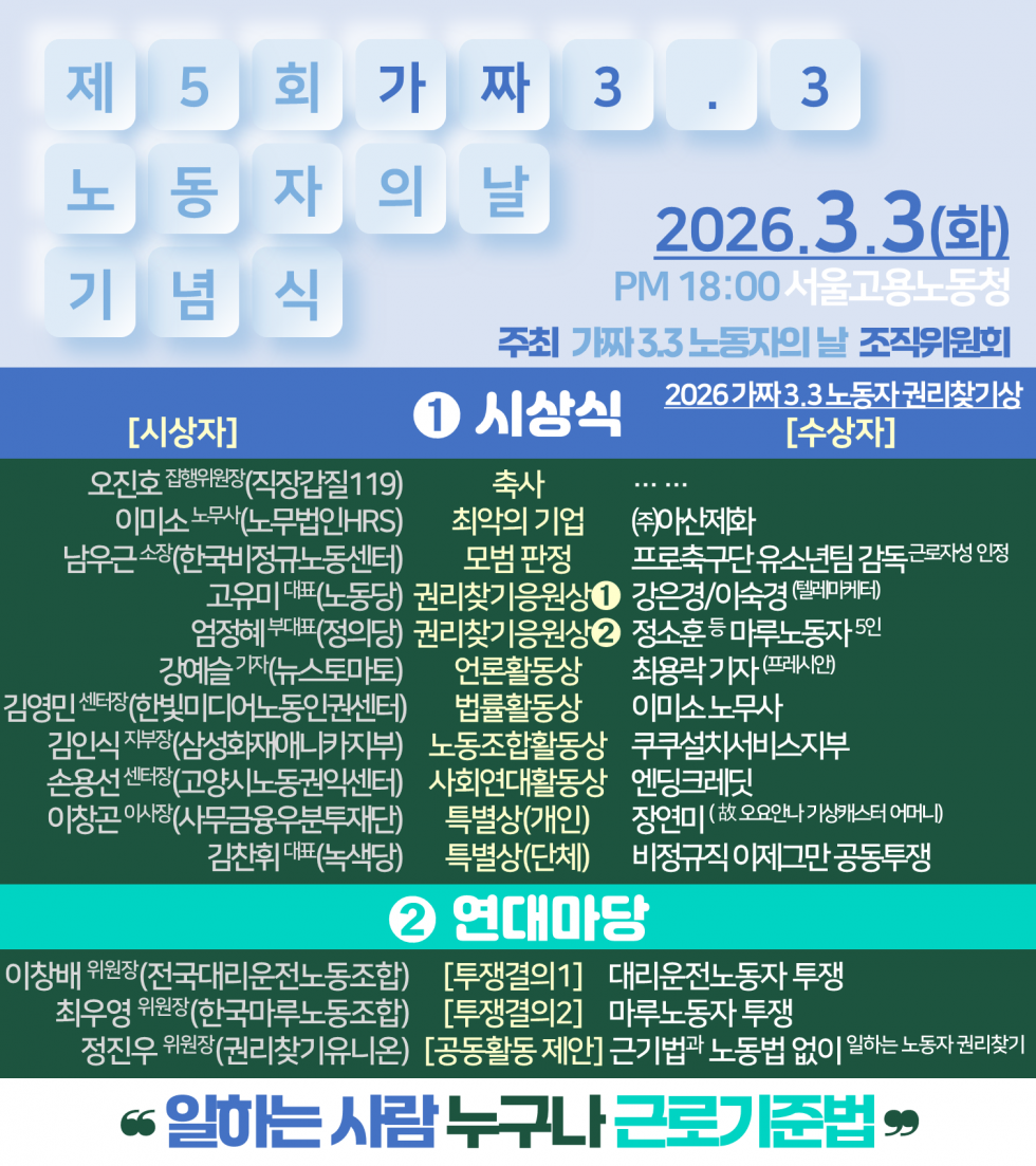 0. 올해 3월 3일은 제60회 납세자의 날이자 제5회 가짜 3.3 노동자의 날입니다. 사업소득세(세율 3.3%)를 납세하는 가짜 3.3 노동자들의 현실을 조명하는 날입니다. 가짜 3.3 당사자 조직과 사회단체들이 조직위원회를 구성하고, 해마다 기념식을 개최합니다. 그동안 힘차게 펼쳐온 노동자성 회복 투쟁의 성과를 공유하며 권리찾기운동의 사회적 연대를 확장해왔습니다. 올해는 처음으로 실내를 벗어나 서울고용노동청 앞에 기념식 무대를 차리고, 근로기준법 쟁취로 나아가는 투쟁의 힘을 모아내며 노동자의 이름과 권리를 찾는 반격의 5막을 엽니다.