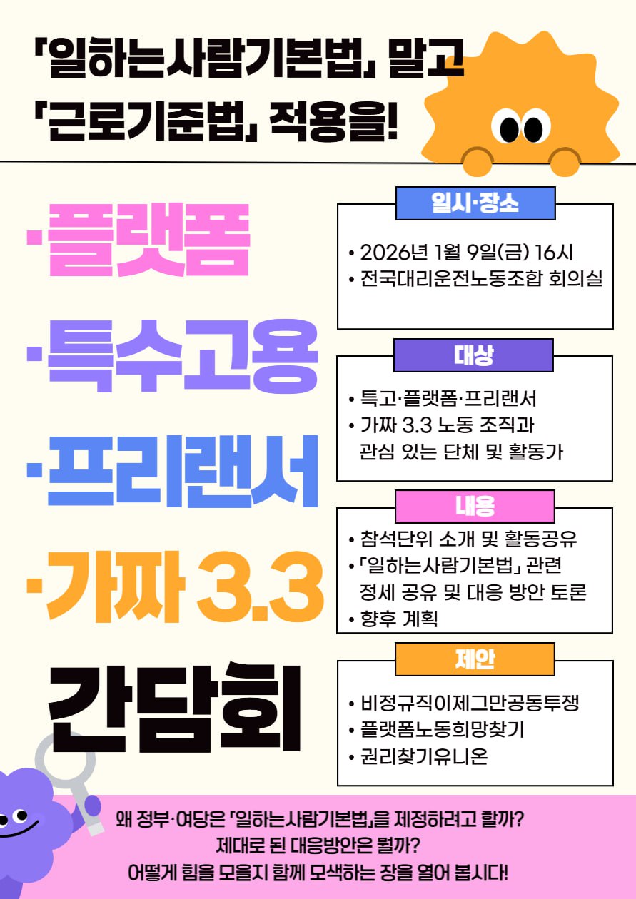 농성단의 상당수는 근로기준법 없이 일하는 플랫폼·특수고용·프리랜서 노동자다. 이들은 ‘일하는 사람 기본법’에 대한 당사자 입장과 사회적 대응을 논의하는 자리를 갖자고 제안해 왔다. 특수한 고용 형태로 분류되지 않더라도 근로기준법 없이 일하는 노동자가 많은 현실을 감안해 ‘플랫폼·특수고용·프리랜서·가짜 3.3 간담회’라는 긴 이름을 정했다. 대다수가 근로소득세가 아닌 사업소득세(세율 3.3%)를 납부하는 만큼, 피해 당사자들을 ‘3.3 노동자’로 지칭한다.
