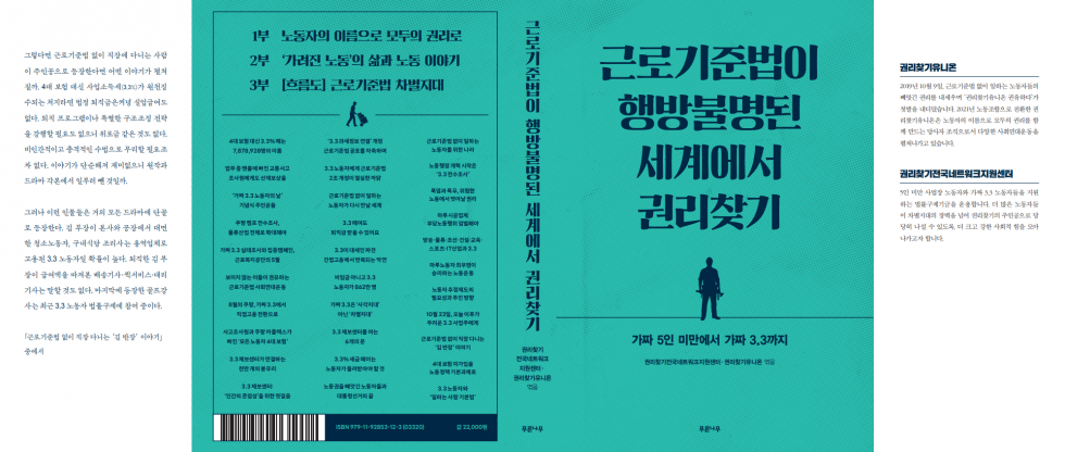 근로기준법이 행방불명된 세계에서 사업주는 최저기준 미만의 근로관계를 운영하며 법 없이 사업할 수 있는 특권을 누릴 수 있다. 사업장 규모를 위장하는 ‘가짜 5명 미만’과 세금의 종류를 악용하는 ‘가짜 3.3’이 대표적 수법이다. 이 책의 주인공들이 공동법률구제에 나서며 처음 명명했던 이 이름들은 이제 근로기준법 없이 일하는 노동자를 향한 사회적 연대의 주제가 되었고, 국정과제의 표제어로까지 올라섰다.